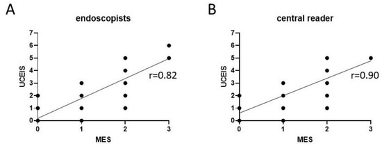 Correlation between MES and UCEIS. As indirect evaluation of validity of the two scores, Spearman correlation between the two scores is represented for the seven endoscopists (A) and for the central reader (B).