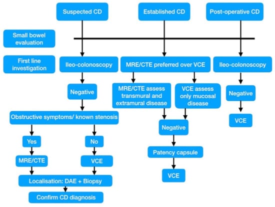 Algorithm for small bowel evaluation in a suspected, established and post-operative Crohn’s disease (CD). DAE—Device assisted enteroscopy, MRE—Magnetic resonance enteroclysis, CTE—computed tomography enteroclysis, VCE—video capsule endoscopy.