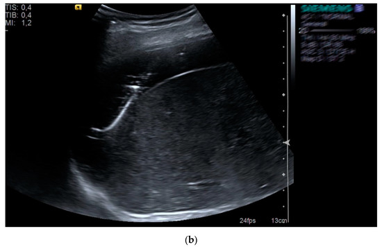 Afterwards, we established its features regarding: content (hypoechoic, hyperechoic, mixt), rim, boundaries (nearby organs, structures etc.), distance from skin, interposing vessels. Afterwards, we punctured the collection using an 18-Gauge Chiba needle under real-time sonographic guidance. We aspired a small quantity of fluid to confirm position and we sent it for microbiological analysis. The next step was the insertion of a 0.035-inch guidewire, while the needle (trocar) was slowly withdrawn. We dilated the incision site by using dilators with progressive diameters. Finally, we inserted a pigtail catheter which was sutured to skin and connected to a bag. Some of the ultrasound images can be seen below, in Figure 2 and Figure 3.
