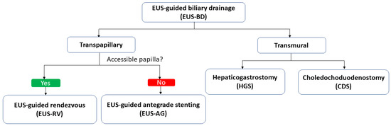 - Miller, C.S.; Barkun, A.N.; Martel, M.; Chen, Y.I. Endoscopic ultrasound-guided biliary drainage for distal malignant obstruction: A systematic review and meta-analysis of randomized trials. Endosc. Int. Open 2019, 7, E1563–E1573. [Google Scholar] [CrossRef] [PubMed]