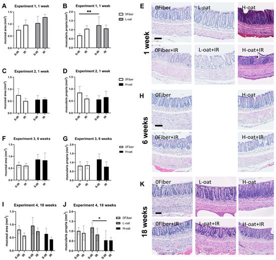 At week 1 post-irradiation, large areas with short and dispersed crypts were present. At weeks 6 and 18, areas of short, dispersed as well as swollen, and branched crypts were present after irradiation. The morphometric analyses of the short-term effects (1 week) showed a significant effect of diet (ANOVA, p < 0.01) and irradiation (ANOVA, p < 0.05) for L-oat and 0Fiber on the mucosal area, as well as an interaction (ANOVA, p < 0.05) on the muscularis propria area. Multiple comparisons showed a tendency towards a reduced mucosal area in the 0Fiber group compared with L-oat (p = 0.06) also present in the irradiated groups (p = 0.05). Further, animals fed L-oat had a significantly increased muscularis propria area compared to 0Fiber (p = 0.008) (Figure 1A–D). Morphometric analyses of the intermediate effects (6 weeks) showed a diet effect on mucosal area (ANOVA, p < 0.05), but no significant differences were observed in the multiple comparison analyses compared with non-irradiated controls. Neither were the effects of diet or irradiation observed on the muscularis propria area (Figure 1F,G). Analyses at 18 weeks showed a significant effect of diet (ANOVA, p < 0.05) and irradiation (ANOVA, p < 0.01) on the mucosal area. However, multiple comparisons revealed no significant difference compared to controls. A significant effect of diet were found in the analyses of the muscularis propria area (ANOVA, p < 0.05) and multiple comparisons revealed that animals in the H-oat group had reduced muscularis propria compared to the L-oat group (p = 0.02) (Figure 1I,J). In conclusion, morphometric analyses showed that dietary fiber altered, in particular, the area of the muscularis propria, both in the short and long-term. L-oat animals displayed an increased area present at 1, but not at 18 weeks of post-S-IR, and H-oat animals showed a reduced muscularis propria at 18 weeks S-IR. Representative micrographs are presented in Figure 1E–K.
