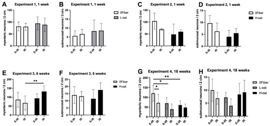 Effect of diet and irradiation on enteric neuronal numbers. (A,B) In experiment 1, the measures of myenteric (A) and submucosal (B) neurons showed no effect of diet or irradiation at 1 week. (C,D) In experiment 2, no effect of diet or irradiation on myenteric (C) and submucosal (D) neuronal numbers was found. (E,F) In experiment 3, more myenteric neurons (E) were observed in the H-oat IR group compared to the 0Fiber IR group. No effects on the submucosal (F) neuronal numbers were observed. (G) In experiment 4, the 0Fiber group displayed more myenteric neurons compared to animals fed L-oat and H-oat. Irradiation significantly reduced the number of myenteric neurons in the 0Fiber IR group but not the L-oat or H-oat group. (H) In experiment 4, there was no effect of diet or irradiation on the submucosal neuronal numbers. S-IR sham-irradiation, IR irradiation, n = 3–10, * p < 0.05, ** p < 0.01. Note that data are presented as mean ± SD.