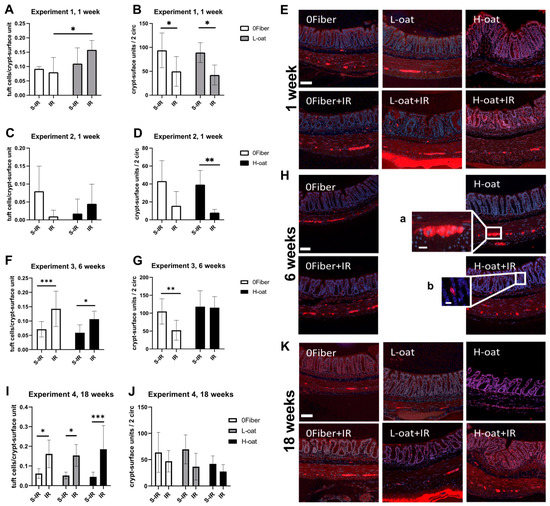 Tuft cells have been shown to play an important role in maintaining the epithelial barrier after irradiation [23]. An effect of diet (ANOVA, p < 0.05) was observed on tuft cell numbers at one-week post-irradiation. Multiple comparisons revealed the presence of more tuft cells in L-oat animals after irradiation than in 0Fiber animals after irradiation (p = 0.02) (Figure 3A,C). In the intermediate-term experiment (6 weeks), an irradiation effect was observed (ANOVA, p < 0.0001), with irradiation inducing a significant increase in tuft cells in both 0Fiber (p = 0.0009) and H-oat (p = 0.02) (Figure 3F). In the long-term experiment (18 weeks), significant effects of radiation on tuft cell numbers (ANOVA, p < 0.0001) was found. Irradiation treatment significantly increased tuft cell numbers in all diets (0Fiber p = 0.01, L-oat p = 0.01, H-oat p = 0.0004) compared to their respective controls (Figure 3I). In conclusion, irradiation treatment induced a long-lasting and significant increase in tuft cells, regardless of diet. The results and representative micrographs are presented in Figure 3E–K.