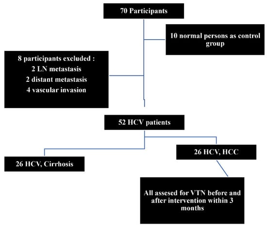 During the study period, we observed 62 individuals, 10 normal persons as control group and 52 HCV patients; Among them, 26 cirrhotic patients with HCV and 26 HCC patients on top of HCV (Figure 1).