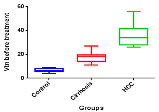 Patients with chronic hepatitis, compensated cirrhosis, and decompensated cirrhosis had lower plasma VTN levels than healthy people. The amount of plasma VTN reduced as hepatic dysfunction worsened in chronic liver disorders [].
