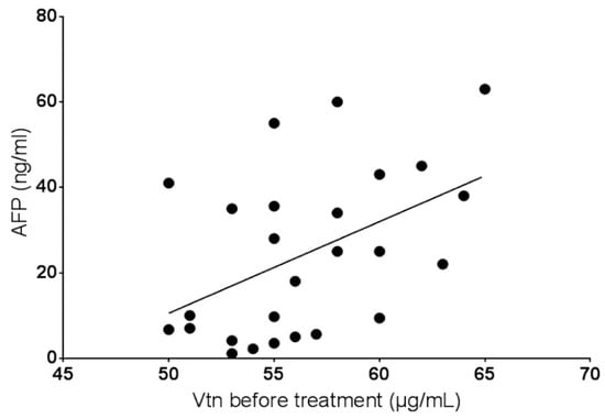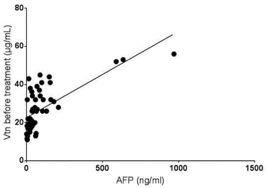 Correlation between serum levels of VTN before treatment and AFP of cirrhosis patients. A significant positive correlation was observed between VTN before treatment and serum AFP of cirrhotic patients (r = 0.492, p = 0.011).