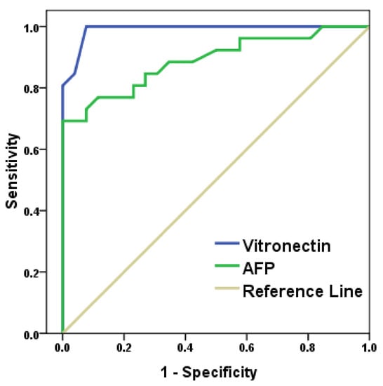 AUC of serum levels of VTN and AFP were conducted for determination of cutoff values and differentiation between patients of HCC and cirrhosis (Table 6 and Figure 7). Serum VTN and AFP showed significant AUCs (p < 0.0001, p < 0.0001, respectively) that could differentiate between HCC and cirrhosis patients. The cut–off level of serum VTN 26.5 μg/mL (AUC = 0.990, 95% CI = 0.973–1.008, p < 0.0001, sensitivity = 84.6%, specificity = 96.2%), AFP 38.5 ng/mL (AUC = 0.890, 95% CI = 0.799–0.981, p < 0.0001, sensitivity = 80.8%, specificity = 76.9%) was decided by using ROC Curve analysis.