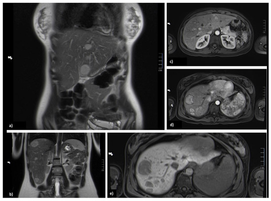 Images at diagnosis. (a,b) Coronal T2-weighted image, showing multiple nodular lesions with bilobar distribution, hyperintense on T2-WI. (c,d) On arterial axial T1-weighted GRE 3D FS image, the lesions show high signal intensity compared with surrounding liver parenchyma. (e) axial T1-weighted 3D GRE FS—the lesions are hypointense on 20-min delayed hepatobiliary phase image, with hepatospecific contrast (Gd-EOB-DTPA), because of the lack of normal functioning hepatocytes.