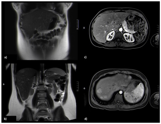 Re-evaluation, comparative with Figure 1, dimensional improvement of nodular lesions; (a,b) Coronal section, lesion is hyperintense on T2-weighted image; (c,d) Axial GRE 3D FS T1-weighted sequence post-Gadoxetic acid intravenous administration at arterial phase, with hyperintense lesions.