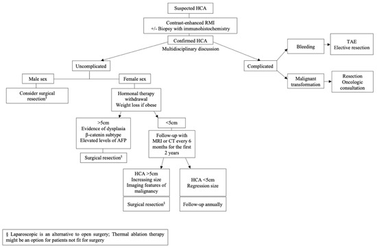 Surgical resection is recommended for patients at risk of developing complications, namely lesions >5 cm, HCA increasing in size during follow-up and β-catenin subtype (especially exon 3). It is also recommended on male gender, rising levels of AFP, imaging suspicious for malignancy or inability to rule out HCC, or when dysplasia is present on biopsy [16,34].
