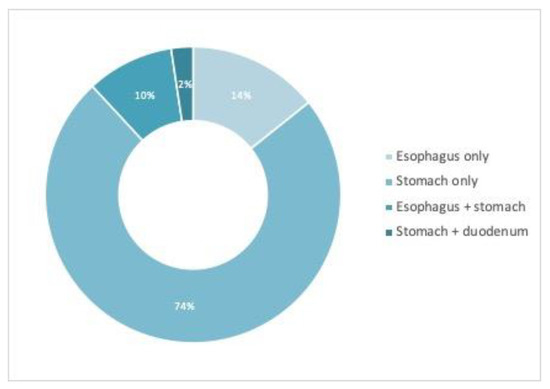 Besides villous atrophy, associated endoscopic findings (at least one) were detected in 42/79 (53.16%) of patients, as follows: esophageal (peptic esophagitis, esophageal candidiasis, esophageal heterotopic gastric mucosa, short segment Barrett’s esophagus)—10 cases; gastric (hiatal hernia, gastritis, gastric ulcer, subepithelial lesion)—36 cases; duodenal (diminutive sessile polyp)—1 case; Figure 1. Five patients had combined endoscopic findings. Most of the gastric lesions were minor endoscopic findings—small sliding hiatal hernias, non-specific chronic gastritis, but we also found two cases of peptic ulcers, one case of metaplastic gastritis, six cases of atrophic gastritis and one subepithelial lesion. Only one patient had changes in the duodenum except CD-related findings—an inflammatory polyp in the duodenal bulb. No malignancies were found.
