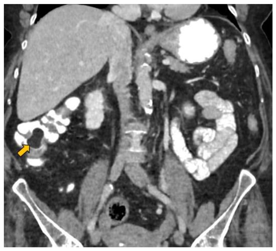 Coronal CT reconstruction of the abdomen with intravenous and oral contrast showing the colonic lipoma (yellow arrow).