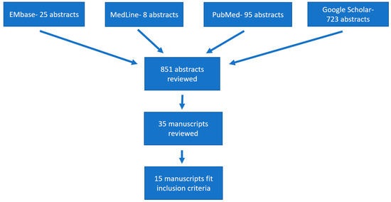 Our search string yielded 851 results, and all were reviewed by a single researcher (see Figure 1). All studies included are cohort studies. Only 15 publications fit the inclusion criteria of AI applications to EoE, 10 full manuscripts, one poster presentation, and four abstracts. We emailed authors of manuscripts we could not gain access to, as well as abstracts to obtain full manuscripts and poster presentations. Of the included publications, AI applications included: analyzing biopsy histology (6), diagnostics using biopsy mRNA transcripts (3), diagnosing EOE via endoscopic photos (5), and automating measurement of layers of esophageal tissue thickened in EoE (1). All studies except two abstracts met criteria for good study design using the QUADAS quality assessment tool. See Table 1 for full description of included studies.