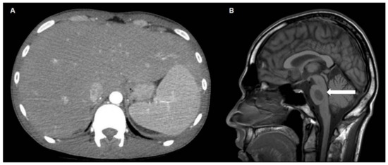 (A) Coronal CT scan of the abdomen homogeneously showing hepatomegaly and splenomegaly; (B) Sagittal magnetic resonance imaging view of central pontine localization of T-Cell lymphoma (white arrow).