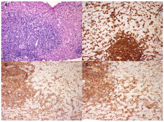 Thereafter, the patient was referred to the Gastroenterology Department for further investigation. Drug ingestion, alcohol consumption and high-risk behaviors were excluded. Tests for mycoplasma, brucella, legionella, bartonella, leptospira, cytomegalovirus, Epstein–Barr virus, hepatitis A, B, C and E, and parvovirus B19 were all negative. Infectious Mononucleosis, Rapid Test, Serum (MONOS) was negative. Screening tests for HIV, leishmaniasis, tuberculosis, histoplasmosis, and common metabolic and autoimmune disorders were negative, as well as the rest of the blood, urine and stool cultural examinations. Empirical and serology-guided antimicrobial therapies due to the evidence of low-title IgM chlamydia pneumoniae and herpes simplex antibodies detected during diagnostic work-up were both ineffective, and they did not show any worsening effect on cholestasis trends either. A new CT scan of the chest, abdomen and pelvis confirmed a homogeneously enlarged liver (long axis, 21 cm) and splenomegaly (15 cm), without peripheral lymphadenopathy (Figure 1A). Flow cytometry and an immunophenotyping peripheral blood smear were performed, showing only a decreased CD4+/CD8+ ratio (0.97) without circulating clonal lymphoid cells. After 20 days of hospitalization, the patient developed fatigue, notable weight loss (10 kg), fever (up to 39 °C), an abrupt increase in serum bilirubin and ALP (up to 27 mg/dL and 710 U/L, respectively) without bile duct dilation, and a worsening of pancytopenia; meanwhile AST and ALT levels progressively reduced over three weeks (down to 325 U/L and ALT to 252 U/L, respectively). After consultation with hematologists, liver (Figure 2) and bone marrow (Figure 3) biopsies were performed revealing sinusoidal infiltration by medium-sized lymphoid cells positive for CD3 and CD2 and negative for B-cell-associated antigens (CD4 and CD8) and CD5 (T-cell lymphoma phenotypic aberrancy) at the immunohistochemical staining. The immunophenotype and the clinical and radiological findings were thus compatible with hepatosplenic T-Cell lymphoma (HSTCL). The patient started CHOP chemotherapy (cyclophosphamide, hydroxy doxorubicin, vincristine, prednisone) with a transitory clinical and hematologic response. Autologous stem cell transplantation was considered. However, less than 2 months after diagnosis, the patient presented with a central pontine localization of the disease (Figure 1B) and, despite new aggressive treatment with multiagent chemotherapy (Hyper-CVAD), he died from complications of the refractory disease.