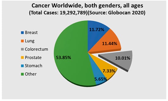 Colorectal cancer (CC) is a major concern in the modern era, where it ranks second in worldwide mortality []. It is also the third most common cancer in both genders []. Figure 1 shows the cases of colorectal cancer worldwide considering both genders []. Polyps are considered an initial sign of colorectal cancer and need to be detected at the early stage. Colorectal polyps can be categorized into various types such as adenoma, serrated adenoma polyp, hyperplastic polyp, and inflammatory polyp sessile []. Each category has a different level of risk of developing into CC []. Inflammatory and hyperplastic polyps have the lowest risk of developing into CC, while adenoma and serrated adenoma polyps have a high risk of developing into CC. Detection at the early stage is a very crucial task that is carried out by experienced gastroenterologists through colonoscopy []. Even though colonoscopy is very effective, it comes with its own limitations. In many cases, polyps can be missed by professionals due to technical or professional errors. This can be due to several factors such as quick scanning through the affected area, polyps not appearing within the visual field, or the polyp size and texture not being very specific []. Sometimes, neoplastic polyps can be very hard to detect, even by experts. Another limitation is that it is a time-consuming process for gastroenterologists and is also a labor-intensive procedure []. For these reasons, the cost of the examination is high in high-population countries []. In this regard, a smart system can help practitioners reduce the polyp miss rate and thus can further reduce the severity of colorectal cancer. To be more specific, implementing an intelligent segmentation system that can segment the specific polyp region within an image will definitely increase the effectiveness of detecting polyps.