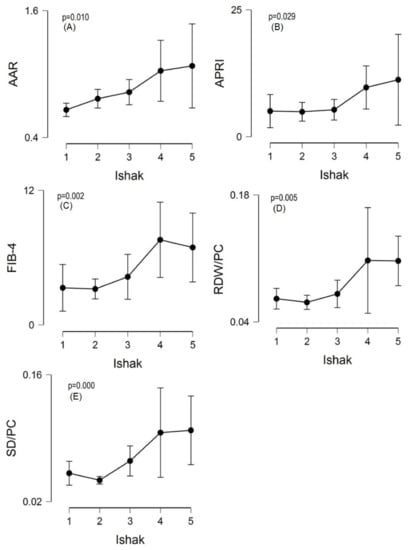 Distribution of NITs for each Ishak stage is shown on Figure 1. Using Kruskal–Wallis test, we found a significant difference among the different stages of fibrosis when comparing the values for SD/PC (p < 0.001), FIB-4 (p = 0.002), AAR (p = 0.002), RDW/PC (p = 0.008) and APRI (0.029).