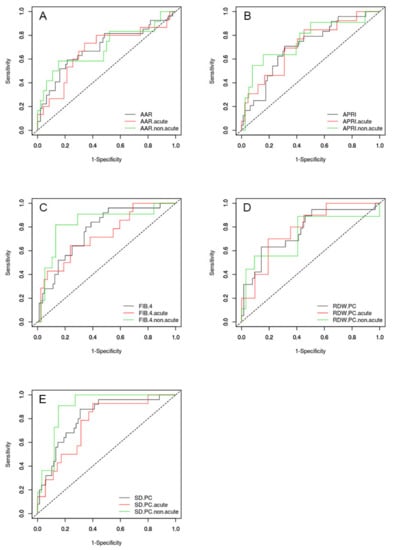 Receiver operator characteristics curves of non-invasive tests for the diagnosis of advanced fibrosis. AUC for (A) AAR: entire population = 0.694, acute patients = 0.674, non-acute patients = 0.697, (B) APRI: entire population = 0.708, acute patients = 0.716, non-acute patients = 0.758, (C) FIB-4: entire population = 0.770, acute patients = 0.724, non-acute patients = 0.834, (D) RDW/PC: entire population = 0.768, acute patients = 0.773, non-acute patients = 0.733, (E) SD/PC: entire population = 0.814, acute patients = 0.754, non-acute patients = 0.902. Black line = entire population, red line = acute patients, green line = non-acute patients.