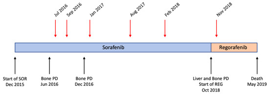 - Bruix, J.; Qin, S.; Merle, P.; Granito, A.; Huang, Y.H.; Bodoky, G.; Pracht, M.; Yokosuka, O.; Rosmorduc, O.; Breder, V.; et al. Regorafenib for patients with hepatocellular carcinoma who progressed on sorafenib treatment (RESORCE): A randomised, double-blind, placebo-controlled, phase 3 trial. Lancet Lond. Engl. 2017, 389, 56–66. [Google Scholar] [CrossRef]