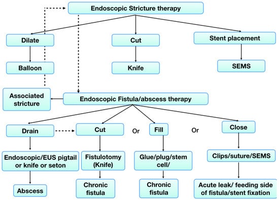 Structural complications of Crohn’s disease (CD) like stricture, fistula and abscess occur after initial 4–5 years of disease [1]. At this juncture, in the absence of current effective anti-fibrotic therapy in IBD, interventional IBD and surgery are the mainstays of treatment. These structural complications occur in a specific sequence: chronic inflammation leads to stricture formation which leads to fistula in the upstream bowel along with abscess. Endoscopic stricture therapy depends on basic principles of dilatation (with balloon), cutting (stricturotomy) and stent placement (self-expanding metal stents SEMS) [2]. Endoscopic treatment of fistula initially includes initial treatment of the associated stricture (with aforementioned techniques) and drainage of abscess if any. Then, chronic fistula can be treated with cutting (fistulotomy), filling (with glue/plug/stem cell) or closure (with SEMS/sutures/clips) (Figure 1) [3]. Apart from CD, stricture/fistula/abscess can occur in ulcerative colitis in the post-operative scenario such as after ileal-pouch anal anastomosis (IPAA).
