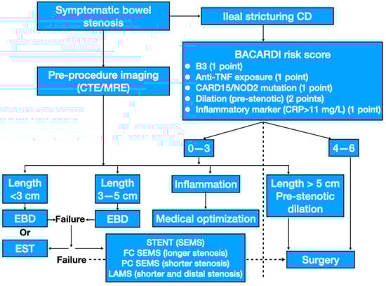 Suggested algorithm for the management of Crohn’s disease (CD) strictures (CTE—computed tomography enterography, MRE—magnetic resonance enterography, B3—fistulizing CD, TNF—tumor necrosis factor, NOD-2—Nucleotide-binding oligomerization domain-containing protein 2, CARD 15—caspase recruitment domain-containing protein 15, SEMS—self-expanding metal stent, FCSEMS—fully covered SEMS, PC SEMS- partially covered SEMS, LAMS—lumen apposing metal stent, EBD—endoscopic balloon dilation, EST—endoscopic stricturotomy, CRP—C reactive protein).