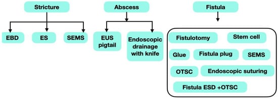 - Yzet, C.; Brazier, F.; Sabbagh, C.; Le Mouel, J.P.; Hakim, S.; Nguyen-Khac, E.; Fumery, M. Endoscopic treatment of enterocutaneous fistulas in Crohn’s disease. Dis. Colon Rectum 2022, 65, 721–726. [Google Scholar] [CrossRef] [PubMed]
