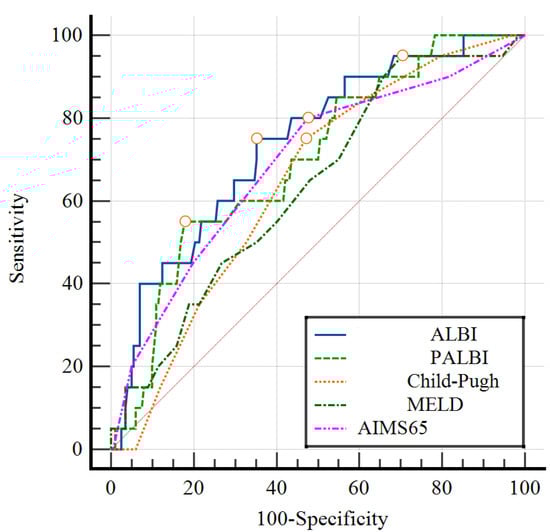 The AUROC of the ALBI score was higher than the CPS, MELD, AIMS65 scores by 0.1; 0.1; 0.05, respectively. However, this difference was not statistically significant (p > 0.05; z < 1.96).