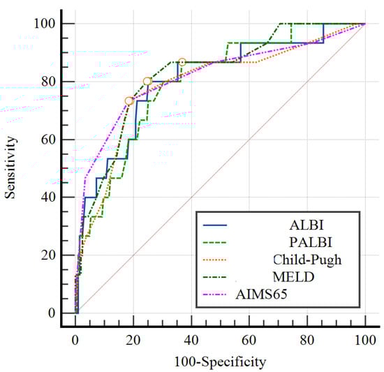Using DeLong test to compare the difference between the scores, the results in Table 5 show that: the MELD score has the highest AUROC, but the difference with other scores is not statistically significant (p > 0.05; z < 1.96). In our study, the predictive value of early mortality of ALBI and PALBI is found to be equivalent to that of the Child–Pugh, AIMS65 and MELD. The results of many studies around the world have also shown that, with the prognosis of in-hospital mortality, all the scores have the same prognostic value [,,].