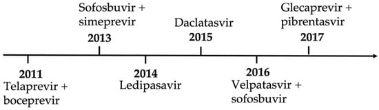 The era of DAA began in 2011 when the two aforementioned PIs were approved for HCV antiviral therapy (Figure 1) [,,,]. This approval was one of the major steps in HCV history. Although single therapy with boceprevir or telaprevir led to a remarkable decrease in the replication of HCV, it led to the emergence of resistance-associated substitutions (RASs) and virological breakthroughs in all treated individuals []. Thus, a change in combination with peg-IFN–RBV was necessary. However, the limitations of this triple therapy were a major concern, from null responders to severe side effects []. The safety concerns were mainly in patients with advanced liver disease with albumin below the normal range and platelet counts under 100/μL [].