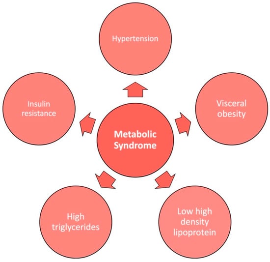 Nonalcoholic fatty liver disease, also known as hepatic steatosis, is a macrovesicular accumulation of triglycerides in hepatocytes. NAFLD affects 25% of the population worldwide, with a male predominance []. It is the most common cause of chronic liver disease and is rising in prevalence in the United States (US) as well as in developing economies such as those in the Middle East, Northern Africa, and Asia. Its rising trend coincides with the global epidemic of diabetes and obesity []. NAFLD is considered the hepatic manifestation of metabolic syndrome. Metabolic syndrome is characterized by the presence of three out of five metabolic abnormalities: hyperglycemia or insulin resistance, decreased high-density lipoprotein (HDL), high triglycerides, visceral obesity, and/or hypertension (Figure 2) [].