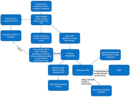The optimal approach to detecting CAD has not yet been clearly established and continues to evolve (Figure 3). Screening and management in LT candidates with coronary heart disease should be individualized based on local expertise and the severity of CAD and liver dysfunction []. NASH cirrhosis has a higher prevalence of single- and three-vessel cardiac disease compared with HCV patients, indicating a more comprehensive cardiac evaluation. For all LT candidates without known coronary heart disease (CHD), the American Heart Association recommends cardiac physical examination, electrocardiogram (ECG), and resting transthoracic echocardiogram (TTE) [,]. Stress testing is needed if a patient has more than two cardiac risk factors, such as age greater than 50, hypertension, hyperlipidemia, and obesity []. The 2013 practice guidelines from the AASLD and American Society of Transplantation also recommend initial noninvasive evaluation with TTE, noninvasive stress testing, and cardiology evaluation if cardiac risk factors are present []. Stress testing can be performed with dobutamine stress echocardiography (DSE) or nuclear perfusion stress testing (single-photon emission computed tomography (SPECT)) []. Dobutamine stress testing has a high predictive value in identifying low-risk groups but has suboptimal results in cirrhotic patients. Patients with decompensated cirrhosis cannot reach a maximal heart rate for accurate results. CT coronary artery calcification scoring and cardiac MRI may be valuable in assessing CAD in advanced cirrhosis, but additional studies are needed for confirmation. If stress testing results are abnormal, coronary angiography is warranted []. Additionally, anatomic coronary imaging is warranted in candidates with a high risk of significant CHD, including those with NASH, diabetes, or with two or more cardiac risk factors. Cardiac risk factors include hyperlipidemia/dyslipidemia, hypertension, CKD, left-ventricular hypertrophy, a family history of premature CHD, a history of smoking, and/or a coronary artery calcification score greater than zero []. A noninvasive form of coronary angiography is coronary computed tomography angiography (CCTA), which can evaluate CHD risk in LT candidates. It has a high negative predictive value in excluding clinically significant CHD [,]. It can be supplemented with CT-derived fractional flow reserve (FFR) to provide supplementary information on coronary blood flow and ischemia-causing lesions [].