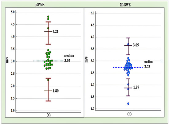 Reference intervals based on pSWE (a) and 2D-SWE (b) for liver metastases from colorectal cancer, including medians and individual values.