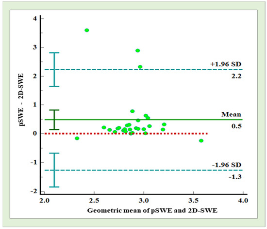 The Bland–Altman plot revealed an arithmetic mean difference of 0.50 m/s (95% CI- 0.143 to 0.821) between point shear wave elastography and two-dimensional shear wave elastography, with the first method tending to produce significantly higher values than the second (p = 0.006). As shown in the plot (Figure 2), the line of the mean difference between the two methods is situated 0.5 m/s above the line of zero difference.