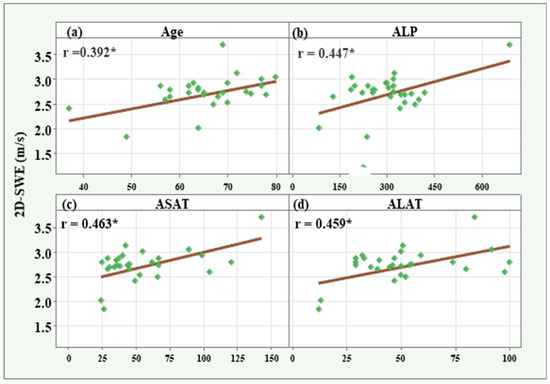 Significant correlations between 2D-SWE and patients’ age (a), ALP (b), ASAT (c) and ALAT (d). *—Significant correlation at p < 0.05.