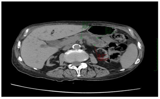 - CT value: this represents the average CT density of the pancreas before surgery []. This parameter directly assesses the extent of fatty infiltration in the pancreas. Its significance lies in its ability to predict the occurrence of POPF prior to surgery, and it is a non-invasive method [].