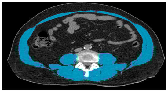 To assess muscle mass, we used the “3D Slicer” software to extract a static image from the preoperative unenhanced CT, specifically at the level of the L3 inferior endplate, excluding any inter-muscle fat striae []. The software facilitated the selection and highlighting of tissues according to their density (Figure 2).