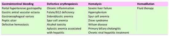 Hematological abnormalities are frequently linked to chronic liver disease of any etiology. About 75% of patients with advanced chronic liver disease experience anemia. The causes of anemia are complex and multifactorial, particularly in cirrhotic patients. Acute and long-term blood loss from the upper gastrointestinal tract, malnutrition, an enlarged spleen brought on by portal hypertension, hemolysis, and coagulation issues are the main causes of anemia. Alcohol, a common cause of chronic liver disease, determines anemia through direct toxicity on the bone marrow, with the suppression of hematopoiesis, through vitamin B6, B12, and folate deficiency due to low intake and malabsorption. In patients with chronic hepatitis C virus infection, antiviral drugs such as pegylated interferon and ribavirin can also cause significant anemia. The use of interferon has been linked to bone marrow toxicity, and hemolytic anemia brought on by ribavirin is a well-known dose-dependent side effect. Within six months of the infection with hepatitis B, hepatitis C, and Epstein–Barr viruses, aplastic anemia associated with hepatitis is seen. This anemia is characterized by pancytopenia brought on by hypocellular bone marrow. Esophageal varices, portal hypertensive gastropathy, and gastric antral vascular ectasia can all cause acute and chronic blood loss. These conditions can progress to iron deficiency anemia, microcytic anemia, and hypochromic anemia. Another common hematologic abnormality in liver cirrhosis is macrocytosis, with multifactorial causes. Vitamin B12 and folate deficiency are frequent in liver cirrhosis, especially of alcoholic etiology, due to increased intestinal permeability, dysbiosis, and malnutrition. Many chronic liver diseases, like viral and autoimmune hepatitis, have a chronic inflammatory substrate. Proinflammatory cytokines, including tumor necrosis factor and interleukin 1, 6, and 10, are the main factors that diminish iron availability in progenitor erythrocytes and subsequent erythropoiesis, leading to the development of chronic inflammatory, normochromic, normocytic anemia.