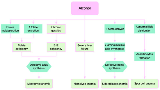 Alcohol consumption contributes to anemia through multiple mechanisms (Figure 3). Alcohol directly affects the hematopoietic cells of the bone marrow, manifesting as pancytopenia, reversible after stopping alcohol consumption. Folate deficiency, found in these patients, leads to macrocytic anemia. Alcohol decreases serum folate levels through various mechanisms, such as increased urinary folate excretion and decreased jejunal absorption [39]. Through its effects on methionine metabolism, folate deficiency contributes to the progression of liver disease by influencing DNA synthesis and stability as well as the epigenetic regulation of gene expression that is implicated in causing liver damage [40].