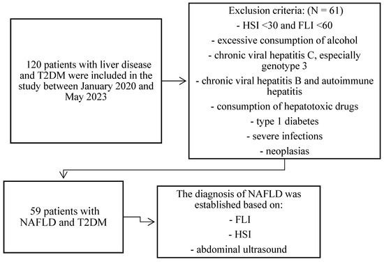 We conducted a retrospective, open study at the Diabetes and Nutritional Diseases Clinic of the Filantropia Municipal Clinical Hospital (Craiova, Romania) during 2020–2023. Initially, 120 patients with T2DM and chronic liver disease were included in the study, of which, after applying the exclusion criteria, 59 patients were subsequently diagnosed, based on the specified inclusion criteria, with NAFLD and T2DM. The medical data of these patients were recorded and analyzed by us in this study (Figure 1).