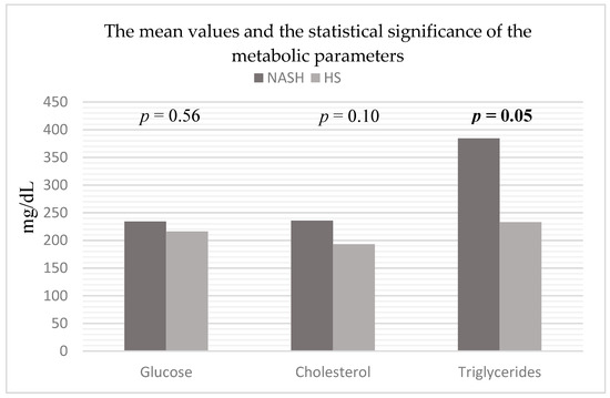 Triglyceridaemia also exhibited statistically significant (p = 0.05) higher mean values in patients with NASH and T2DM (384.26 ± 45.90 mg/dL) compared to patients with HS and T2DM (232.79 ± 14.14 mg/dL) (Figure 2).