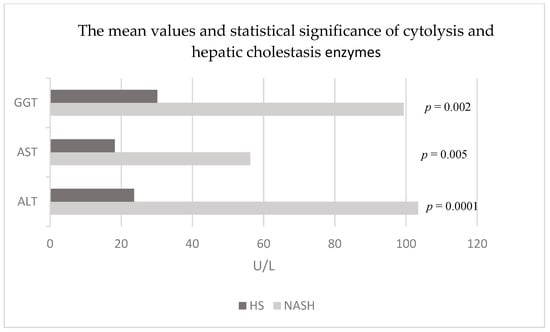 Mean values and statistical significance of cytolysis and hepatic cholestasis enzymes in the studied patients (44 patients with HS and 15 patients with NASH associated with T2DM). Abbreviations: NASH: non-alcoholic steatohepatitis; HS: hepatic steatosis; ALT: alanine aminotransferase; AST: aspartate aminotransferase; GGT: gamma-glutamyltranspeptidase; established by comparing the values of patients with HS and T2DM and the values of patients with NASH and T2DM.