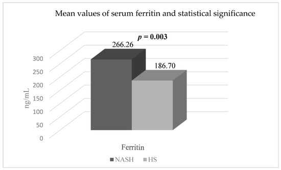 The mean values and statistical significance of serum ferritin in the two groups of patients (44 patients with HS and T2DM and 15 patients with NASH and T2DM). Abbreviations: NASH: non-alcoholic steatohepatitis; HS: hepatic steatosis; p-value was established by comparing the values of patients with HS and T2DM and the values of patients with NASH and T2DM.