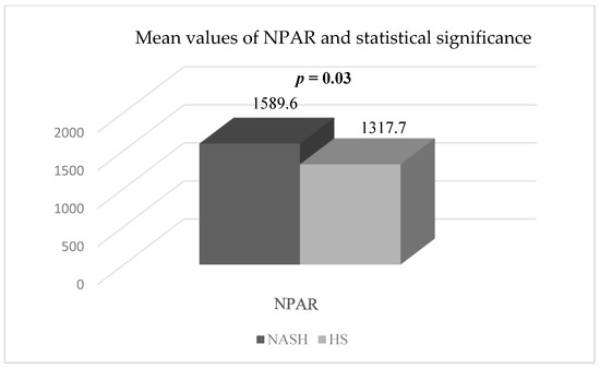 Furthermore, the mean value of the NPAR exhibited a statistically significant increase (p = 0.03) in patients with NASH and T2DM (1589.6 ± 713.15) when compared to patients with HS and T2DM (1317.79 ± 235.88) (Figure 5).