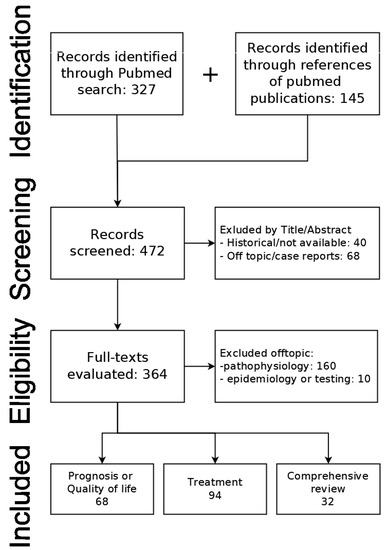 We performed the following search in the Medline database: “((sodium[Title]) OR hyponatremia[Title]) AND (cirrhosis[Title])” in English or Slovak languages. The search was performed on 9 July 2023. The primary search identified 327 publications in the Medline database. References of found publications were also searched for any other relevant publications (n = 145). Relevant publications were screened by title and/or abstract. Historical unavailable publications (n = 40) and off-topic publications along with case reports (n = 68) were excluded. The remaining 364 publications were assessed for eligibility based on full text. Publications focused on epidemiology (n = 10) and pathophysiology (n = 160) were excluded. We included 68 publications on the clinical significance of hyponatremia (prognosis and/or quality of life), 94 publications on treatment, and 32 comprehensive reviews (Figure 2).