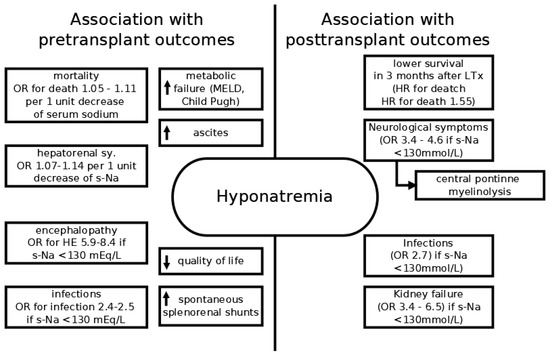 The success of the liver transplantation (LTx) depends in part on the pre-transplant status of the patient. Serum sodium could provide significant information about the risk of post-transplant complications. Quick correction of hyponatremia after the LTx could lead to central pontine myelinolysis. In one series of 379 adult LTx, 12 patients underwent transplantation in hyponatremic condition (s-Na < 127 mmol/L). Six patients developed neurological complications in the early postoperative period, out of which three had central pontine myelinolysis. Confusion was present in two and one patient suffered a seizure [44]. Rapid change in s-Na after LTx was an independent and significant predictor of neurological complications in a study by Lee et al. [45]. Adverse influence of hyponatremia can be followed up to 3 months post LTx. Two studies have documented worse survival, higher rates of neurologic complications (OR 3.4–4.6), and renal failure (OR 3.4–6.5) one month after LTx in patients with s-Na < 130 mmol/L [46,47]. A study by Londono et al. also showed higher odds of infections in patients with s-Na < 130 mmol/L (OR 2.7) [47]. Dawwas et al. followed patients after LTx for three years. Although the mortality of hyponatremic patients was higher even at the end of follow-up, further analysis showed that this excess mortality was limited to the early (3 months) post-transplant period (HR for death 1.55; 95% CI, 1.18–2.04). No significant difference in mortality in the remainder of the follow-up (HR 1.05, 95% CI 0.78–1.42) was found [48]. One of the largest studies that included 2733 patients undergoing LTx for cirrhosis was published in 2016. Authors demonstrated that patients with severe hyponatremia (<125 mmol/L) and hypernatremia (≥ 150 mmol/L) had the worst posttransplant outcomes, however only hypernatremia was associated with poor survival in multivariate Cox regression [49].