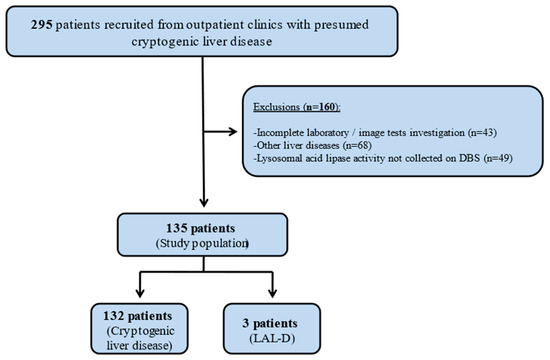 We evaluated 295 patients with presumed cryptogenic liver disease. A total of 160 patients met exclusion criteria and were removed from analyses (i.e., incomplete laboratory/imaging tests investigation: 43 patients; other liver diseases: 68 patients; lysosomal acid lipase activity not collected on DBS: 49 patients). The study population consisted of 135 patients, and 3 of them (2.2%) were diagnosed with LAL-D. Figure 1 shows the flowchart of the study population enrollment.