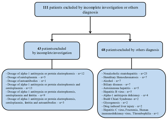 Among the main causes of patient exclusion due to other diagnoses, non-alcoholic steatohepatitis was observed in 23 patients (33.8%) submitted to liver biopsy. Hereditary hemochromatosis was detected in 7 patients, biliary diseases in 7 patients, and excessive alcohol consumption in 7 patients. The most frequently omitted laboratory tests for investigating liver disease, which led to patient exclusion from the study, were alpha-1 antitrypsin/protein electrophoresis and ceruloplasmin dosage, respectively. These data are described in Figure 2.
