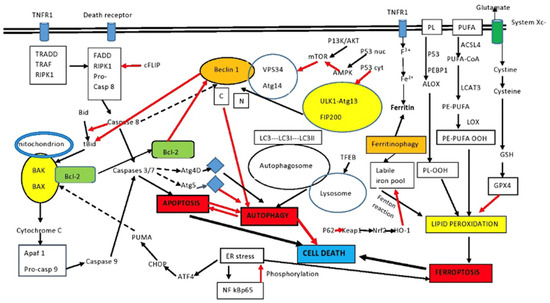 Finally, autophagy and apoptosis may cause cell death when acting in concert. The exact mechanisms are still under investigation. One such mechanism may be the liberation of cathepsins from autolysosomes, which may kill the cell during autophagy and, at the same time, cleave BID, increasing apoptosis via activation of BAX and BAK [86,87]. Figure 1 shows the complicated interactions of autophagy and apoptosis in connection to ferroptosis.