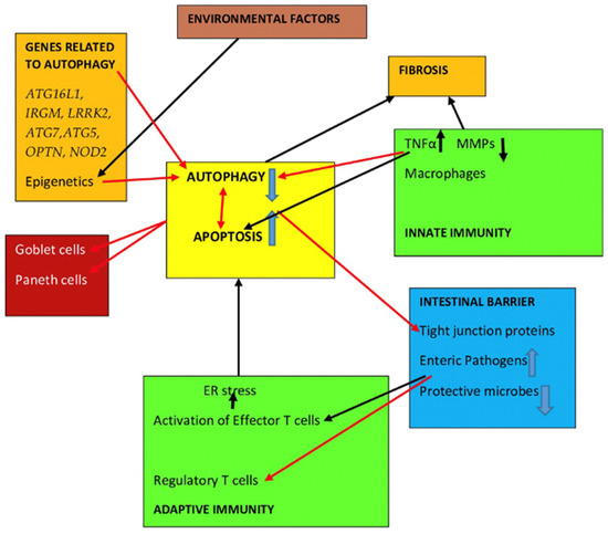Impaired autophagy is observed in several cells of the damaged mucosa of IBD patients [23,161]. Emerging evidence indicates that there is an interplay among three important cellular pathways in the pathogenesis of IBD. These include apoptosis, autophagy and the unfolded protein response induced by endoplasmic reticulum stress [176,177]. Autophagy is the central regulator in IBD pathophysiology, as it is connected to all the defensive mechanisms of the intestinal mucosa. Dysfunctional autophagy affects several processes, such as intracellular microbial clearance, antimicrobial peptide production by Paneth cells, production of mucus by goblet cells, antigen handling by dendritic cells and pro-inflammatory cytokine secretion by macrophages [178,179,180,181]. Some research data on these defense parameters have been presented in the previous subsection but additional collective details are given below.