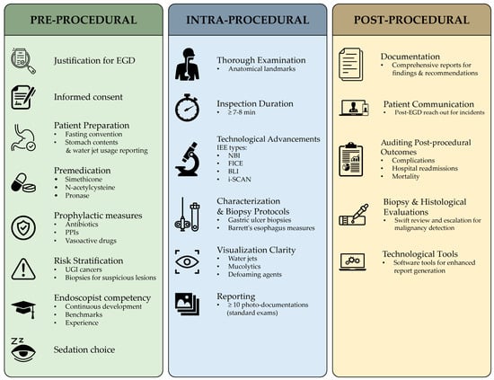 Concise representation of the pre-procedural, intra-procedural, and post-procedural QIs for an EGD procedure. This visualization provides a quick reference for the measurable benchmarks crucial for assessing each EGD healthcare delivery process phase. For a detailed checklist of these indicators, refer to Table 3.